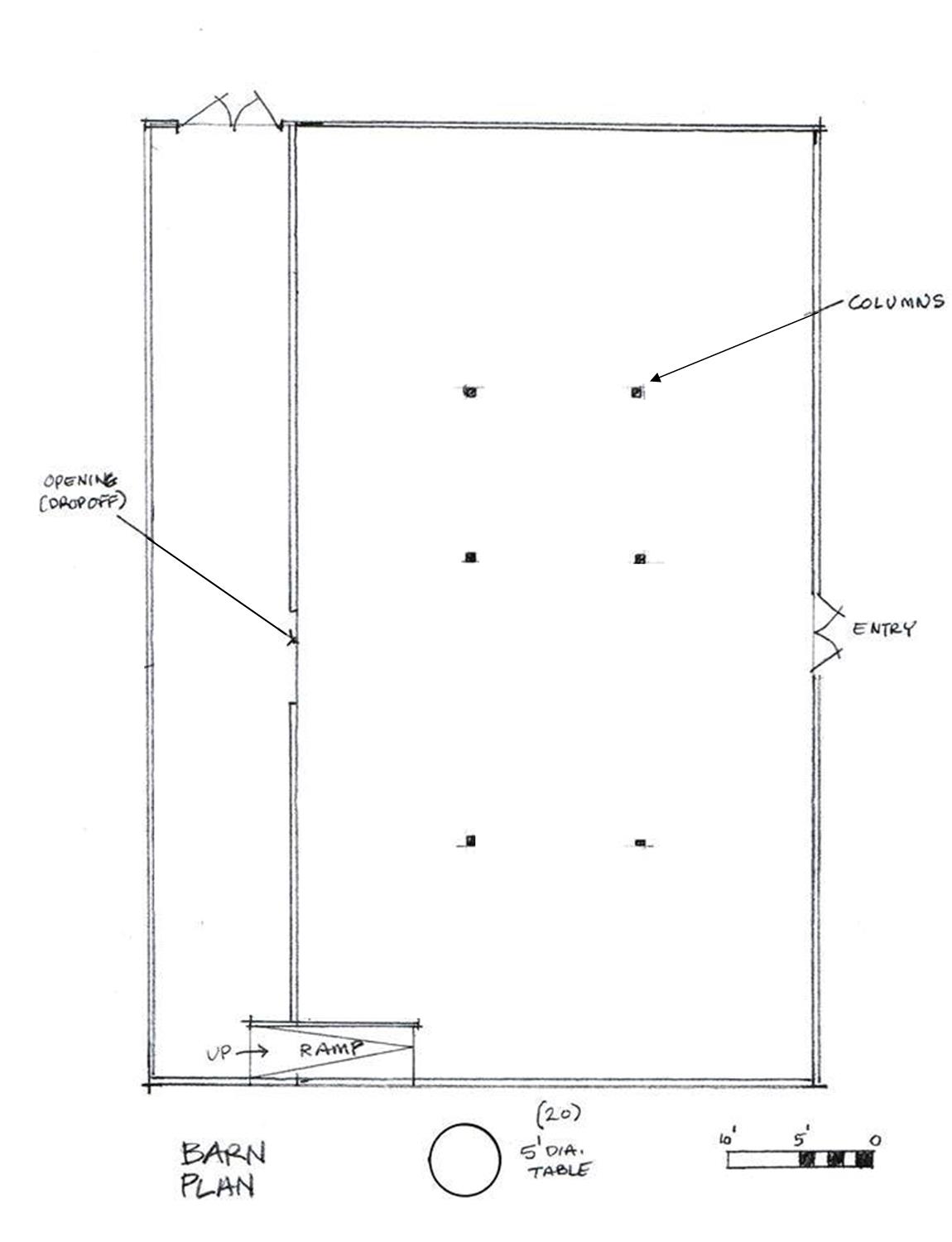 The main floor of The Barn is approximately 38’ x 64’ with a ramp at the north end leading to a concrete walkway running behind the main floor. 6 columns help to break up the area. Here is our layout.